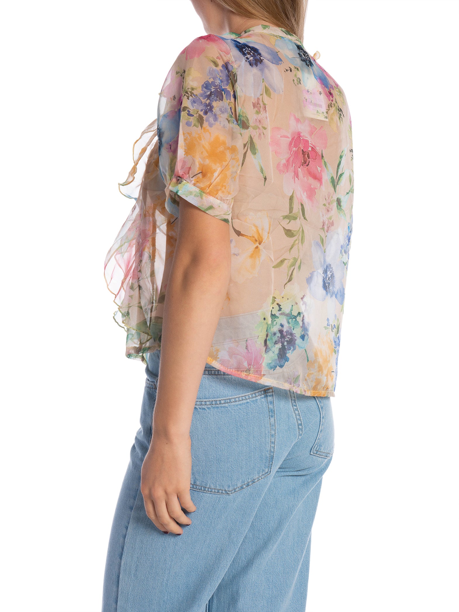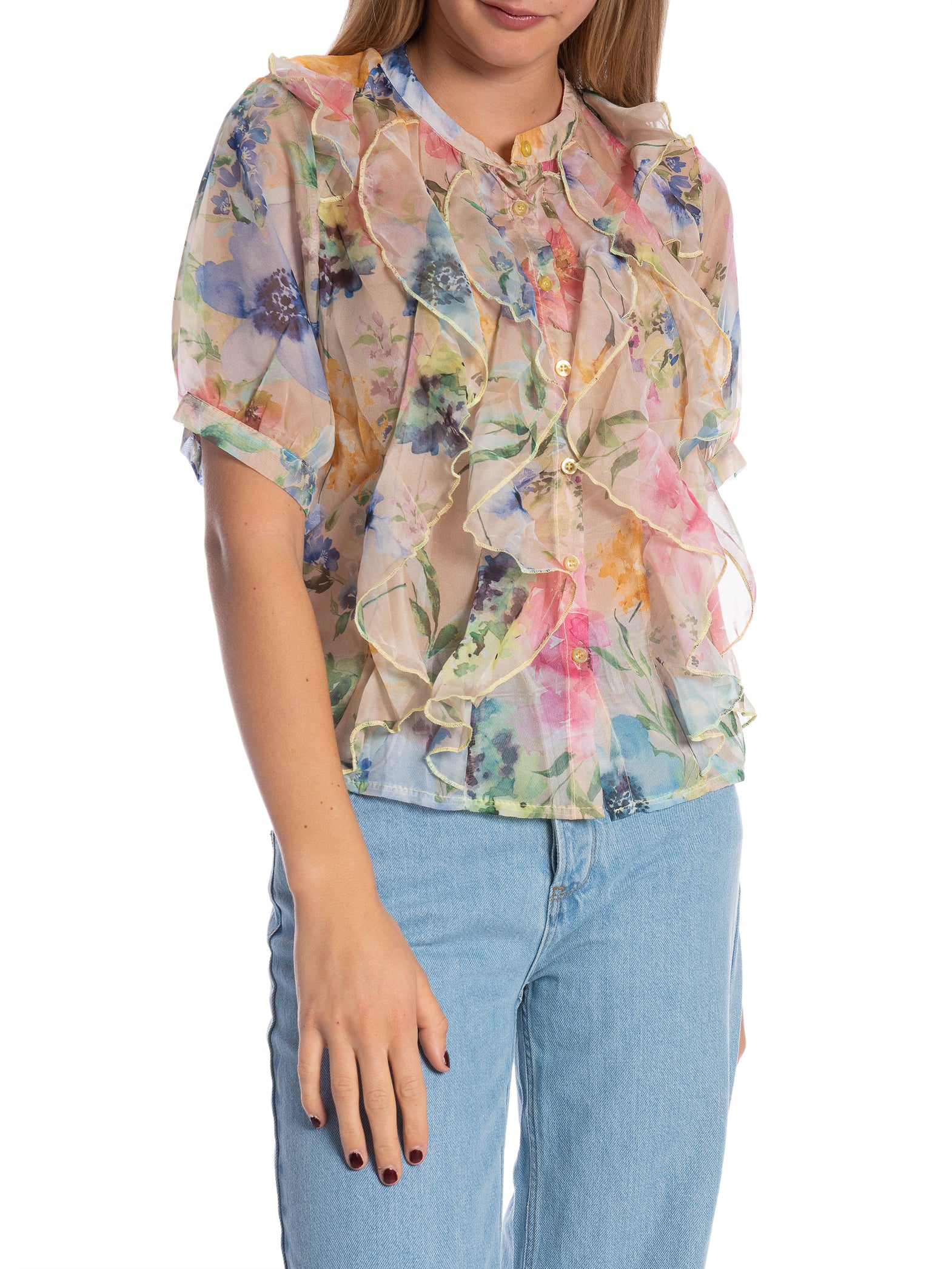 Blus Ruffled Flower. En härlig skir blommig blus med kort ärm och rundad halsringning. Knappar framtill. Volangdetaljer framtill. Bär med ett par ljusa denim eller kjol!
