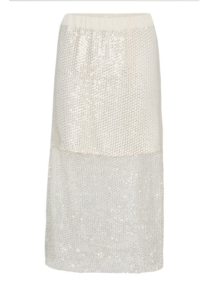 Kjol Paula från Karen By Simonsen. En vacker paljettkjol. Designad med ett kortare foder som låter benen synas. Kjolen är i en midilängd och har bekväm resår i midjan.